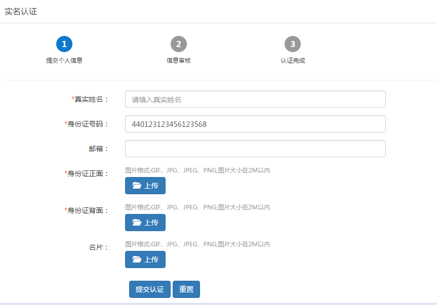 步驟三:填入真實姓名、身份證號、郵箱、上傳身份證正反面圖片以及名片圖片,完成后點擊“提交認證”按鈕。