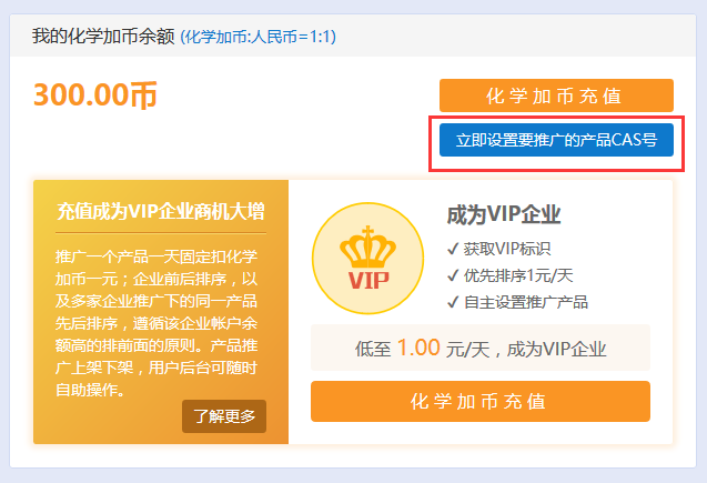 友情提示:賬戶需要有化學加幣才能設置產品,若您還未充值化學加幣,請先前往充值。