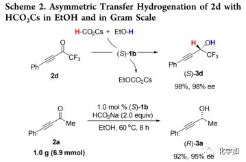 通過原位紅外光譜追蹤炔基酮2d與HCOOCs的不對(duì)稱轉(zhuǎn)移氫化(Figure 1)。實(shí)驗(yàn)發(fā)現(xiàn),HCOOCs提供氫后轉(zhuǎn)化為碳酸乙基銫(EtOCO2Cs)。當(dāng)2d(1704cm-1)與1.2 eq HCOOCs(1602cm-1)在(S)-1b (2 mol %)催化下于60 ℃反應(yīng)時(shí),1704和1602cm-1處的峰迅速降低,而新峰1640cm-1(屬于EtOCO2Cs)增加。反應(yīng)3 h后,1704和1602cm-1處的峰消失,1640cm-1處的峰成為單個(gè)主峰。此外,在1743cm-1(屬于乙酸乙酯)處沒有明顯的峰。這些結(jié)果表明甲酸鹽和EtOH在反應(yīng)中分別用作氫化物和質(zhì)子源(Scheme 2)。