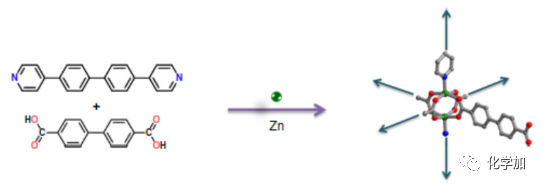 圖1. 文中使用的配體結(jié)構(gòu)圖及形成金屬-有機材料中的pcu拓?fù)渚W(wǎng)絡(luò)的示意圖。