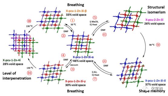 圖2. 金屬-有機材料X-pcu-1-Zn-3i-α的6種物相及其相互轉(zhuǎn)化過程與表現(xiàn)出的4種類型的刺激響應(yīng)行為的示意圖。