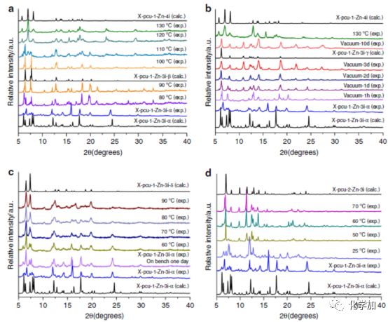 圖3. 原位變溫粉末衍射圖:表征金屬-有機材料X-pcu-1-Zn-3i-α受相關(guān)外界刺激發(fā)生響應(yīng)的過程。