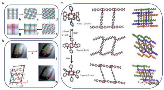 圖5. a)X-pcu-1-Zn-3i-α轉(zhuǎn)變成X-pcu-1-Zn-4i的機理推斷示意圖;h)X-pcu-1-Zn-3i-α的光學(xué)熱顯微鏡圖;m)X-pcu-1-Zn-3i-α、X-pcu-2-Zn-3i和X-pcu-1-Zn-3i-δ之間轉(zhuǎn)化過程中金屬節(jié)點異構(gòu)化的示意圖。