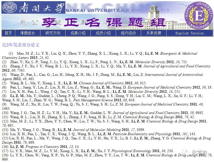 李正名在有機化學領域辛勤耕耘,他從青年時代許身化學,渴望在這個領域有所成就,1953年來到南開大學以后,李正名成為楊石先校長的助手,而后又成為他的第一名研究生,他的碩士畢業證是楊先生親筆寫的,001號。作為中國著名的老一輩教育家和科學家,楊石先的治學品格,對年輕的李正名影響很大,他在楊石先教授身邊工作30多年的時間為日后農藥化學研究領域取得的系列成就打下了堅實的基礎。他繼承楊石先老校長嚴謹治學精神,先后指導培養166名研究生(64名博士、2名博士后和100名碩士),在創建農藥國家工程研究中心過程中,志愿為化工專業9名職工指導研究并獲得有機化學碩士學位。李正名課題組共發表論文660篇、專利授權17件,編著專業書4本。李正名院士先后獲得全國科技大會獎、國家自然科學獎二等獎、國家科技進步獎一等獎、國家技術發明獎二等獎、中國農藥工業杰出成就獎。