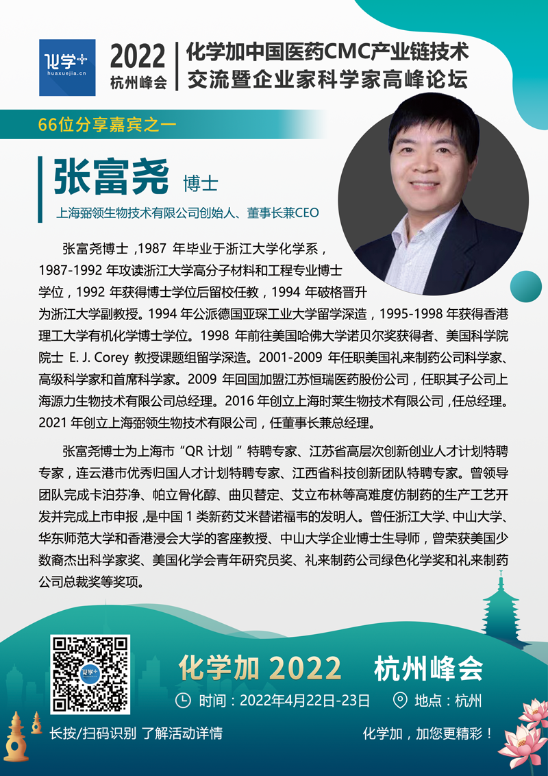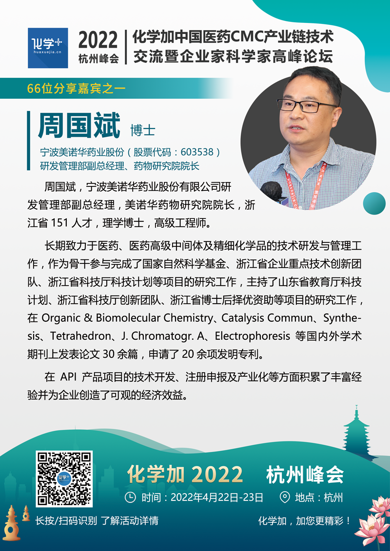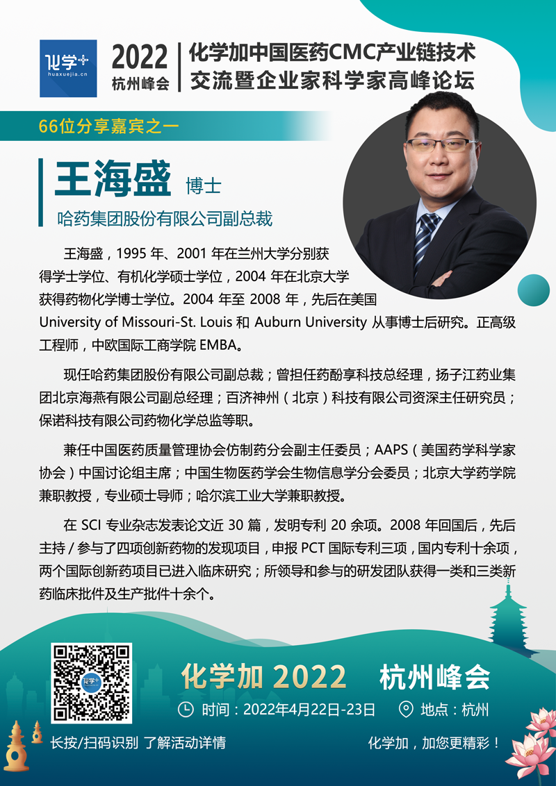 化學加2022(杭州)中國醫藥CMC產業鏈技術交流暨企業家科學家高峰論壇將于4月22-23日在杭州舉辦。主要面向制藥產業創新藥研發企業(包括小分子大分子/ADC藥物/雙抗藥物企業)、CXO企業、以及實驗室建設/安全運營、綠色化學合成領域從業者。著重高層次前瞻技術研判、一線運營管理經驗分享,藥學/臨床/制劑-CRO/CMO/CDMO服務創新合作對接,及部分優質藥化項目產學研金融資源路演對接合作。本次峰會規模約800-1000人,熱烈歡迎藥物研發/生產企業,CRO/CMO/CDMO服務企業,原料藥/中間體/精細化工企業,實驗室建設/運營管理企業,基金投行人士,及產業集群&功能定位明確的園區招商運營方報名參會。