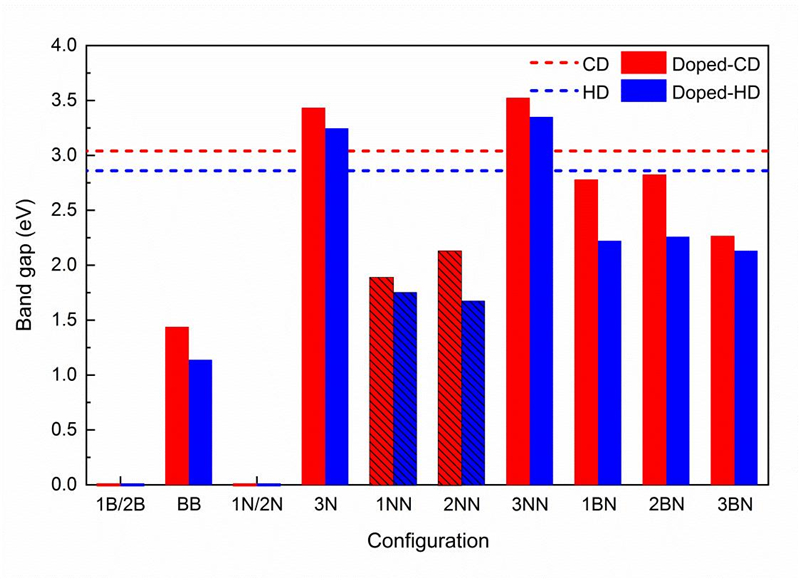 圖3. 不同摻雜構型的帶隙。單色的柱狀表示直接帶隙,有斜線的柱狀表示間接帶隙。紅色虛線和藍色虛線分別表示純的立方金剛石烯和六方金剛石烯的帶隙