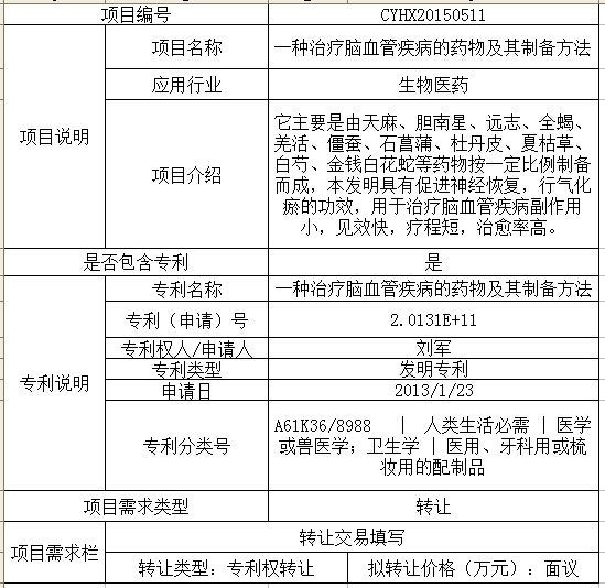 | 項目說明 | 項目名稱 | 一種治療腦血管疾病的藥物及其制備方法 | |